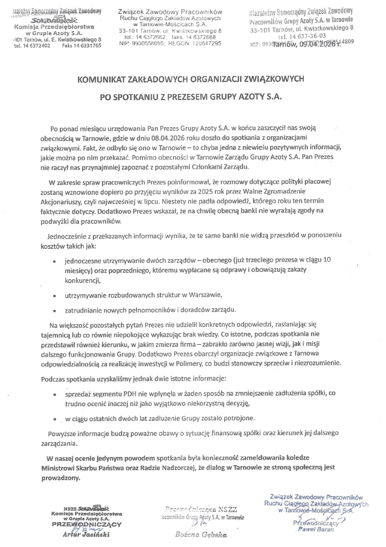KOMUNIKAT ZAKŁADOWYCH ORGANIZACJI ZWIĄZKOWYCH Po Spotkaniu z Prezesem Grupy Azoty S.A. 10 kwietnia 2026 0 Poprzedni wpisŻyczenia ŚwiąteczneNastępny wpis Pismo w sprawie spotkania z Radą Nadzorczą Grupa Azoty S.A. Dodaj komentarz Anuluj pisanie odpowiedzi Twój adres e-mail nie zostanie opublikowany. Wymagane pola są oznaczone *Komentarz Nazwa * E-mail * Witryna internetowa Zapisz moje dane, adres e-mail i witrynę w przeglądarce aby wypełnić dane podczas pisania kolejnych komentarzy.