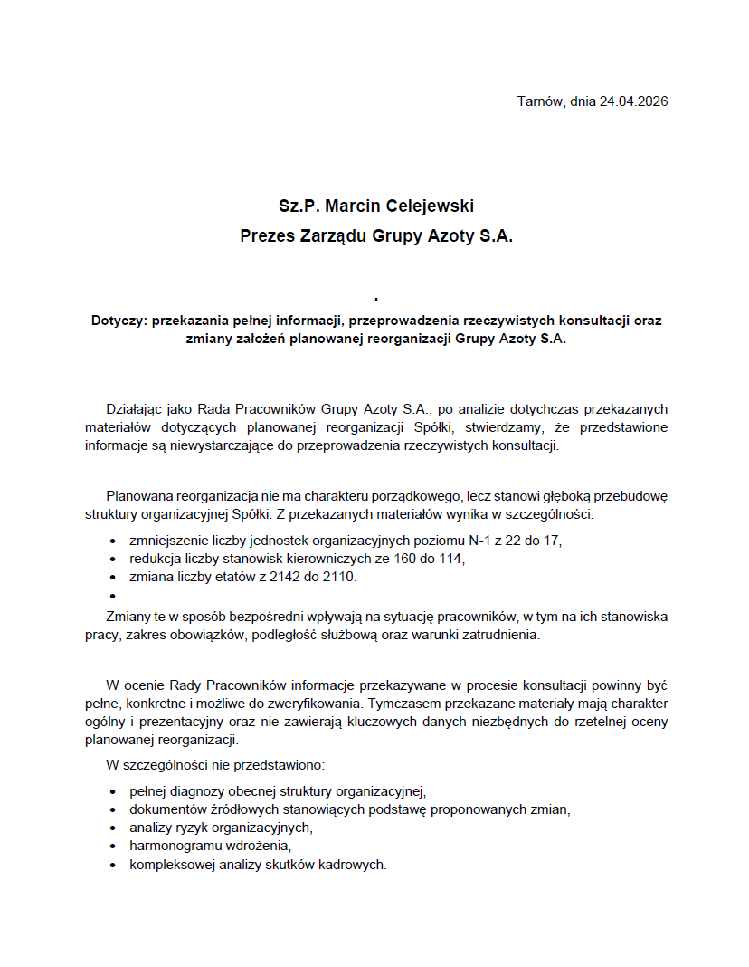 W wystąpieniu ponownie zwróciliśmy się o przekazanie szczegółowych i rzetelnych informacji, które umożliwią przeprowadzenie rzeczywistych, a nie jedynie pozorowanych konsultacji. Podkreślamy, że skala i znaczenie planowanych zmian wymagają pełnej transparentności oraz realnego dialogu ze stroną społeczną.