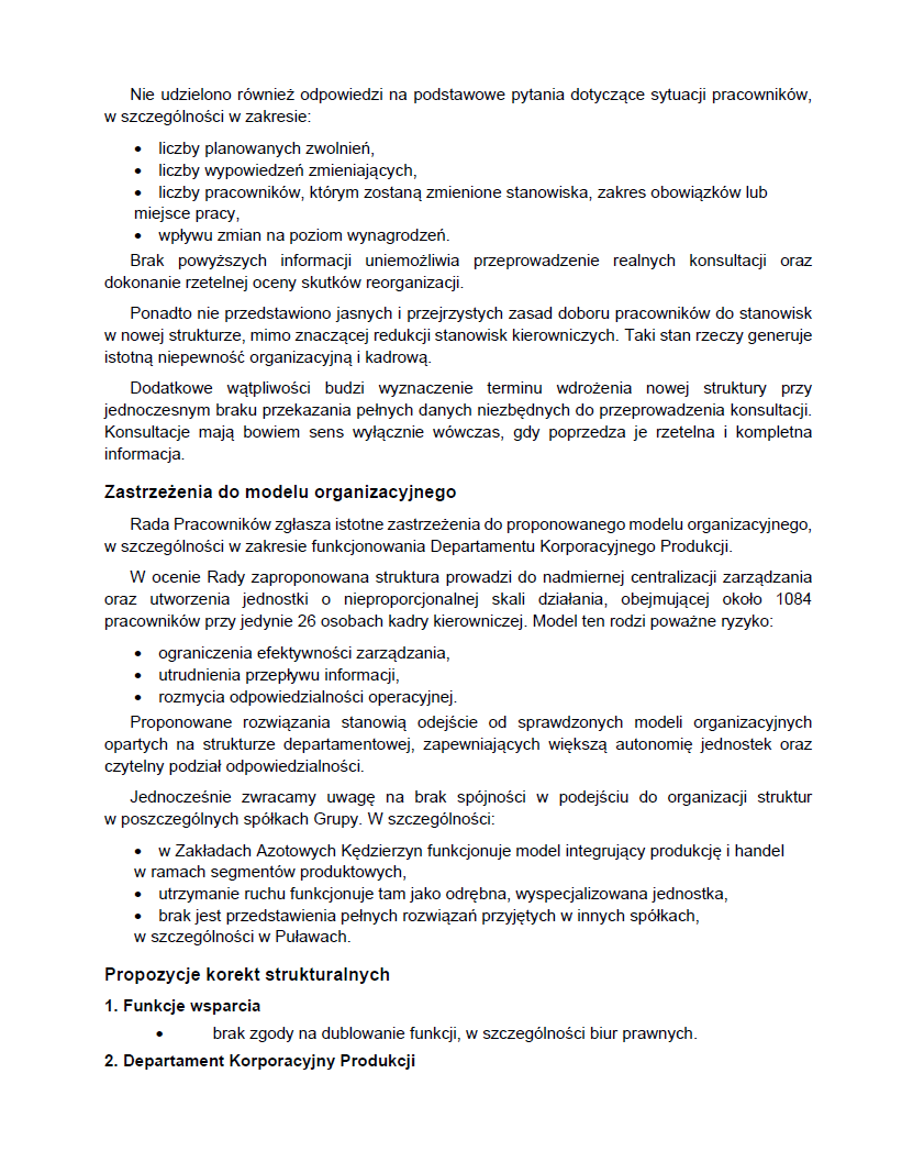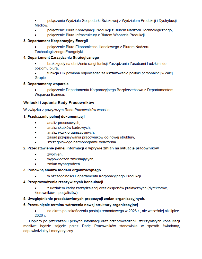 Rada Pracowników skierowała do pracodawcy kolejne pismo dotyczące planowanej zmiany struktury organizacyjnej.