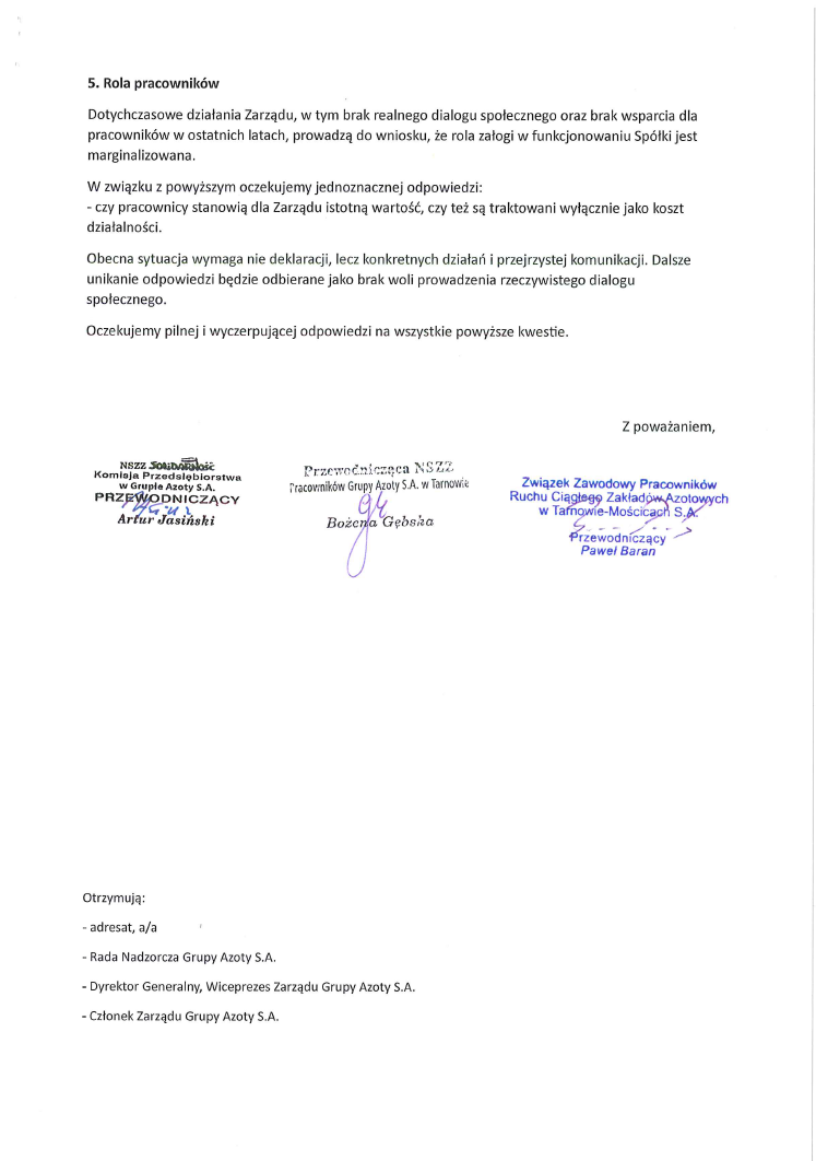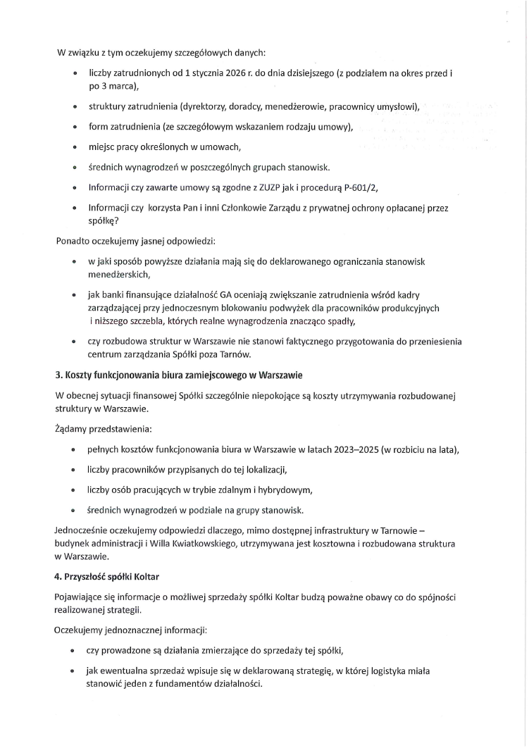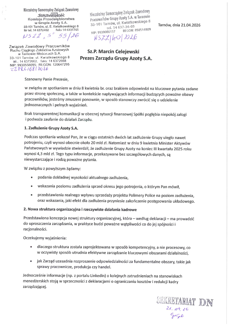 Pismo organizacji związkowych do Prezesa z pytaniami po spotkaniu w dniu 8 kwietnia oraz z bieżącej sytuacji z prośbą o odpowiedź 23 kwietnia 2026 0 Poprzedni wpisInformacja o trwających konsultacjach dotyczących nowej struktury organizacyjnej!Następny wpis Nowa struktura - pytania cd Dodaj komentarz Anuluj pisanie odpowiedzi Twój adres e-mail nie zostanie opublikowany. Wymagane pola są oznaczone *Komentarz Nazwa * E-mail * Witryna internetowa Zapisz moje dane, adres e-mail i witrynę w przeglądarce aby wypełnić dane podczas pisania kolejnych komentarzy.
